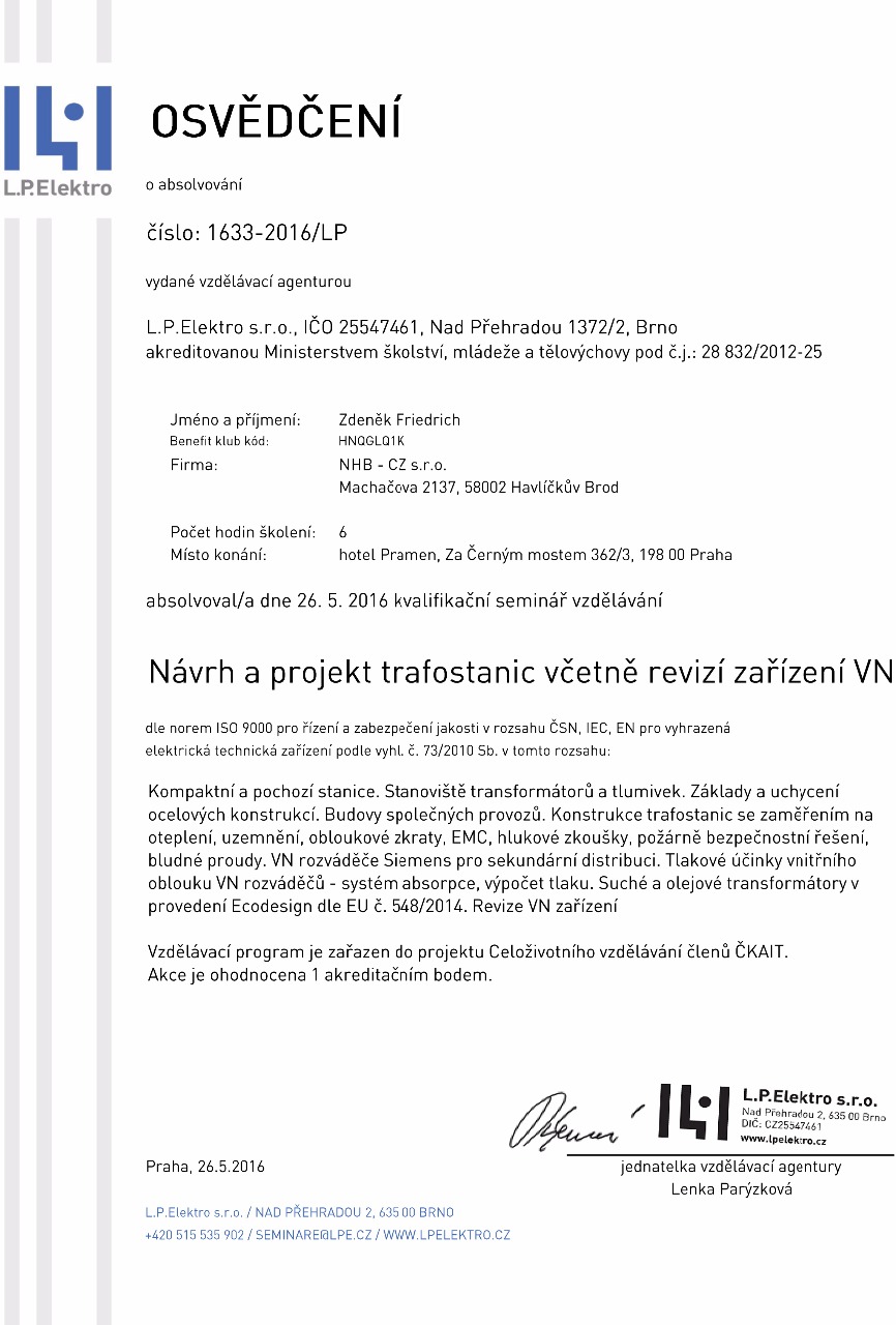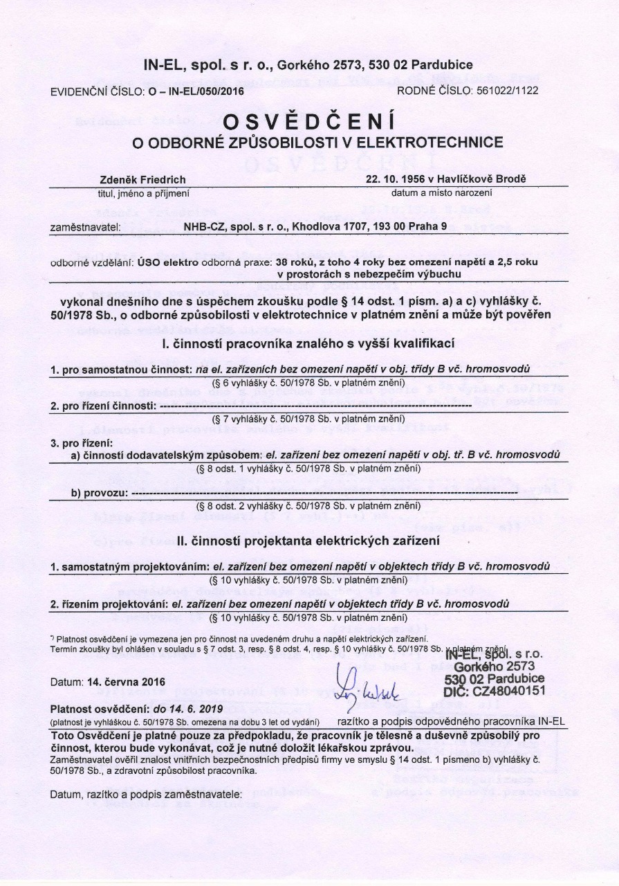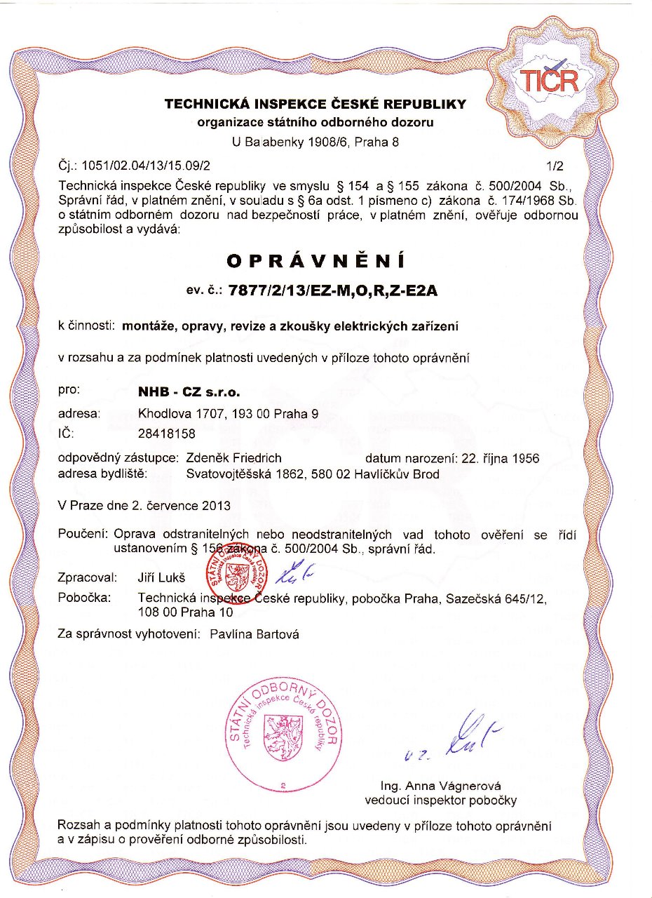 K provádění revizí, montáží, oprav a zkoušek vyhrazených elektrických zařízení máme platné osvědčení i oprávnění vydané SOD, živnost zapsanou v Obchodním i Živnostenském rejstříku.